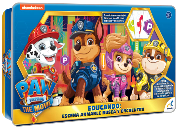 Tablero armable de 24 piezas que hacen una imagen panorámica de Paw Patrol. Incluye tarjetas para jugar busca y encuentra. Viene en estuche metálico coleccionable que mide 26.5cm de largo x 7 cm de ancho x 16 cm de alto y el producto pesa 500 g.