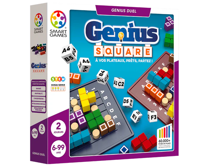 Piensa rápido para resolver los desafíos antes de que tu contrincante. Tira los dados, coloca los 7 cuadros blancos a los que llamaremos “bloqueadores” en el tablero de juego y completa el cuadrado usando las 9 piezas del rompecabezas restantes. No olvides que la piezas blancas no se deben mover luego de colocarlas en el tablero.